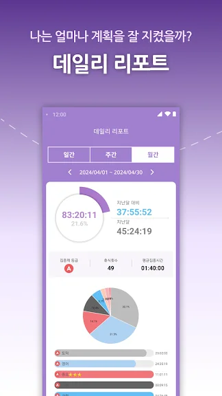 2. 통계, 타임테이블, 리포트(일/주/월별)를 이용해 직관적으로 측정 시간을 확인해 보세요.