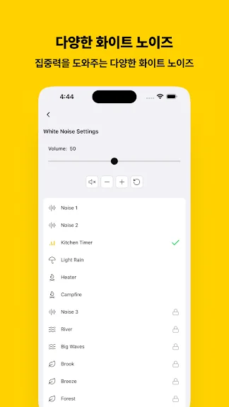 🎶 편안한 화이트 노이즈: 차분함을 유지하고 방해 요소를 최소화하는 화이트 노이즈로 집중력을 유지하세요.