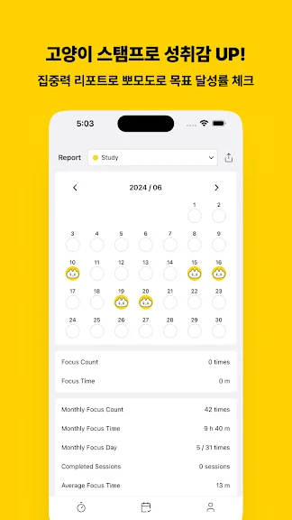 🗓️ 진행 상황 기록: 스탬프 캘린더에 집중한 날을 기록하고 성과를 축하하세요.