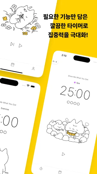 심플하고 직관적인 UI 덕분에 뽀모캣은 방해 요소를 최소화하며, 작업이나 공부에 몰입할 수 있도록 해줍니다. 명상, 운동, 청소, 그림 그리기, 독서 등 어떤 집중이 필요한 활동이든 뽀모캣이 당신의 집중력을 유지하고 즐겁게 만들어 줍니다.