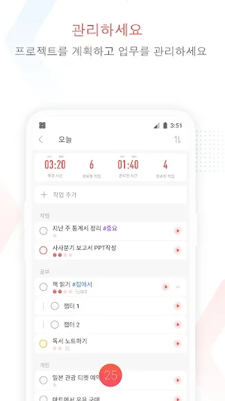 이 어플은 구글플레이스토어에서 "공부시간 관리"로 검색했을때 4번째로 나오는 어플입니다. 아래는 Focus To-Do: 뽀모도로 타이머 + 업무 관리 어플에 대한 자세한 설명이니 참고하세요.