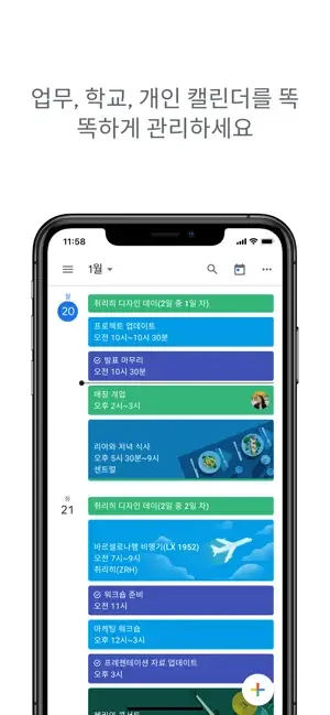 캘린더 앱에서 각기 다른 캘린더 계정의 모든 이벤트를 한 번에 관리하고 추적할 수 있습니다. iCloud, Exchange, Google 등으로부터 계정을 연결하면 됩니다. 캘린더별로 다른 색상을 사용하여 이벤트를 정리할 수 있습니다. 또한 목록 보기, 일별 보기, 주별 보기, 월별 보기에서 모든 이벤트를 함께 볼 수도 있습니다.