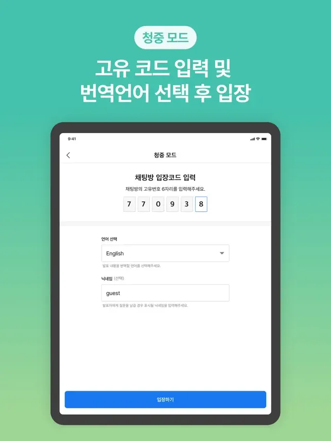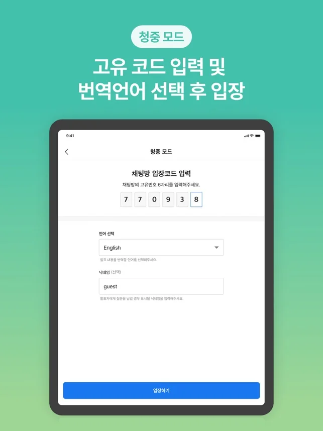 라이브 트랜스레이션이 제공되는 공간에서 앱에 접속 후 언어만 선택하면,