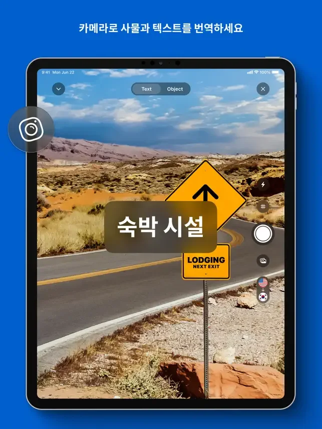 • 번역 카메라 - 카메라 보기를 사용하여 사용자 주변의 텍스트를 번역합니다. 실시간으로 텍스트를 번역하거나, 보기를 일시 정지하고 확대하여 자세히 보거나, 사진 보관함에서 사진에 있는 텍스트를 번역할 수 있습니다.