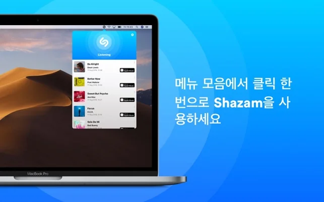 Mac용 Shazam에서는 완전히 새로운 차원의 음악 검색 기능을 제공합니다. 주머니에서 휴대폰을 꺼내지 않고도 몇 초 이내에 어떤 곡이든 찾아드립니다.