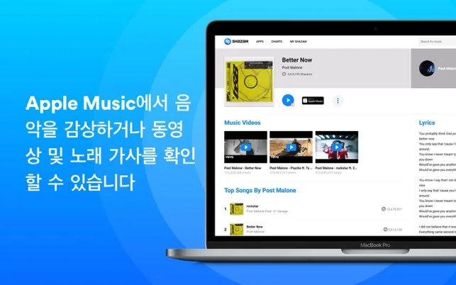 지금 들리는 노래의 제목이 궁금한가요? 주변이나 TikTok, Instagram, YouTube 같은 앱에서 재생 중인 음악이 무엇인지 확인해보세요. 라이브 공연, 노래 가사, 동영상 등을 발견하세요. 다운로드 횟수는 20억을 넘어 지금도 계속 증가하고 있습니다.