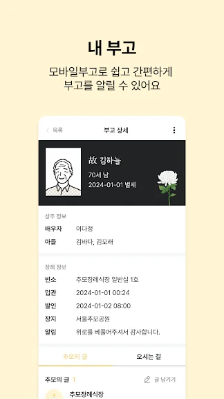 추모 - 대표 모바일 부고장 서비스 어플에 대한 스크린샷 정보가 필요하시다면 아래 이미지를 참고하시기 바랍니다.