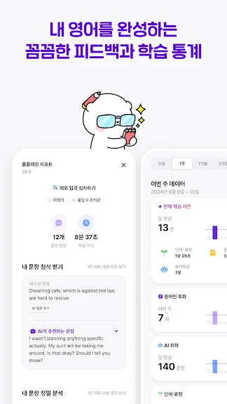 AI가 내 영어회화 실력을 정교하게 분석합니다. 말할 수 있는 문장 길이, 활용하지 못하는 단어, 부자연스러운 표현과 발음 등을 족집게처럼 찾아내죠. 이 분석을 바탕으로 나에게 가장 최적화된 학습을 제안합니다.