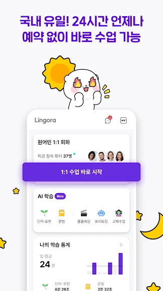 ** 링고라는 언제나 24시간 언제든 예약 없이 실시간 수업 가능!