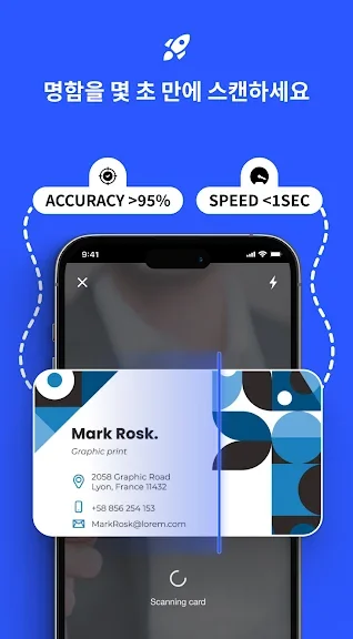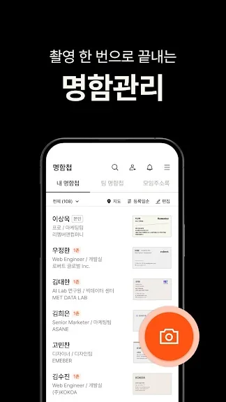 명함관리어플은 명함을 쉽고 빠르게 디지털화하여 관리할 수 있는 최적의 도구입니다. 단 한 번의 스캔으로 명함의 모든 정보를 정확하게 저장하고, 수동 입력의 번거로움을 없애줍니다. 앱을 열고 명함을 카메라로 스캔하기만 하면 즉시 휴대전화에 저장됩니다. 데이터 입력에 드는 시간을 대폭 절약할 수 있는 효율적인 어플입니다.