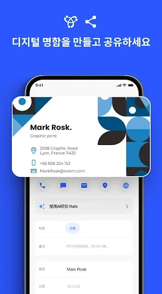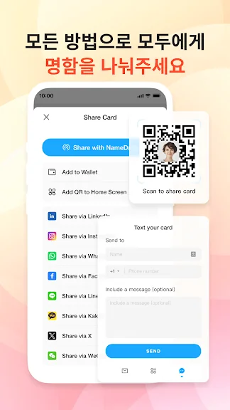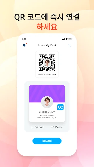 사용 방법은 간단합니다. 사진과 로고를 추가하여 맞춤형 디지털 명함을 제작하거나, 고급 스캔 기술을 활용해 종이 명함을 디지털화하세요. 저장된 명함은 태그와 메모로 관리하며, 다양한 공유 옵션으로 연락처를 손쉽게 전달할 수 있습니다.