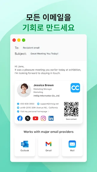추천 이유는 명확합니다. CamCard는 정확한 명함 판독, CRM 동기화, 데이터 보안 등 강력한 기능을 제공하여 비즈니스 네트워킹의 품질을 한층 높여줍니다. 또한, QR 코드나 이메일 서명을 통한 전문적인 브랜드 노출이 가능합니다.