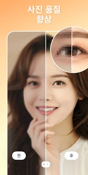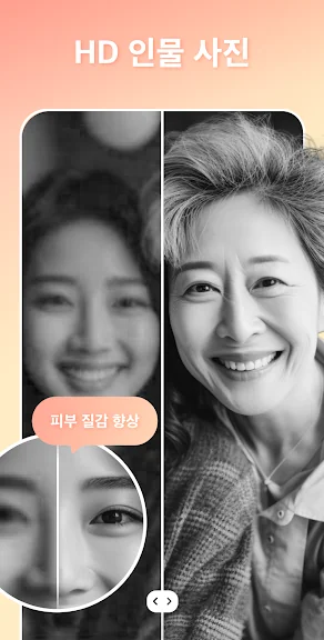 최첨단 AI 기술에 기반한 AI 사진 향상 앱은 놀라운 효과를 통해 10년, 또는 심지어 20년 된 사진을 놀라운 눈 디테일과 완벽한 피부 질감을 갖춘, 마치 최신 휴대폰으로 찍은 것 같은 HD 셀카로 즉시 변환합니다.