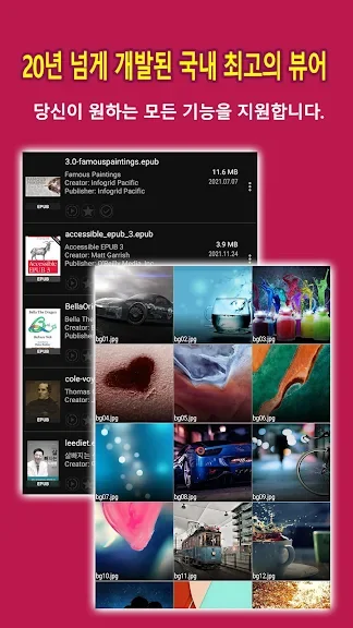 앱 실행 시, 이전에 보던 파일이 즉시 로딩되어 중단 없이 이어 볼 수 있습니다. 탐색기는 폴더 및 파일 정렬, 이름 변경, 삭제 기능을 지원하며, 단순한 검색어 입력으로 원하는 파일을 빠르게 찾을 수 있습니다. 또한, Google 드라이브와 SD 카드를 활용해 파일을 자유롭게 관리할 수 있습니다.